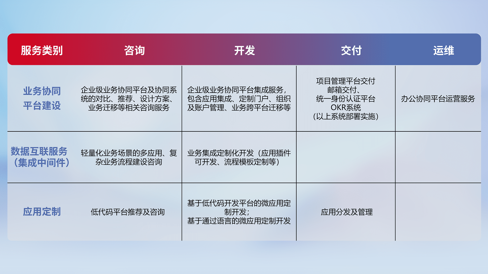 针对钉钉、、、企微、、、、IDaas等平台级产品提供产品的规划、、、方案、、、、交付、、定制化开发等服务,,实现如统一协同办公、、、智能客户服务、、混合会议管理、、、智能数据查询、、等业务场景,,实现数字化转型。。。。
