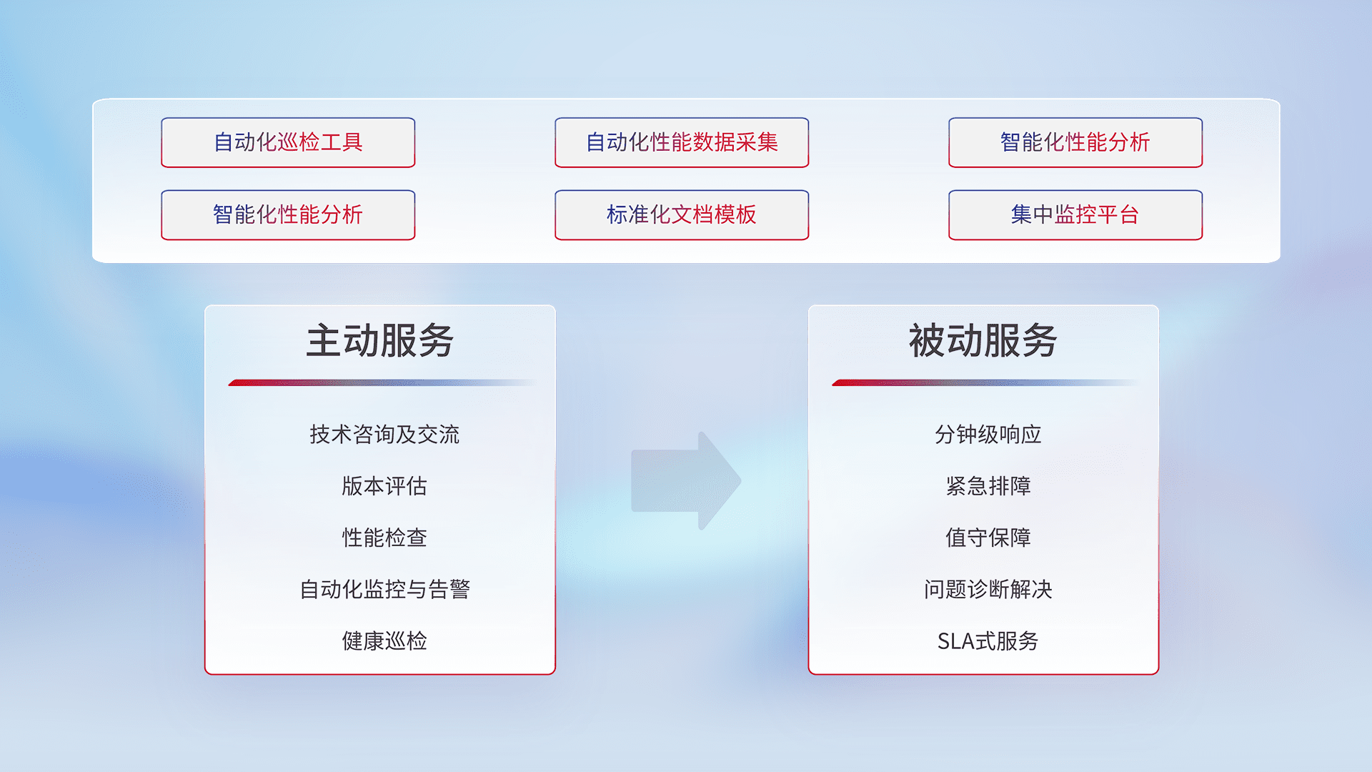 智能化工具和标准化文档,,,保障服务质量,,,,提供主动服务(包含技术咨询、、、、版本评估、、、、性能检查、、、自动化监控与告警、、健康巡检)和被动服务包含(分钟级响应、、、紧急排障、、、、值守保障、、、、问题诊断解决、、、SLA服务)。。